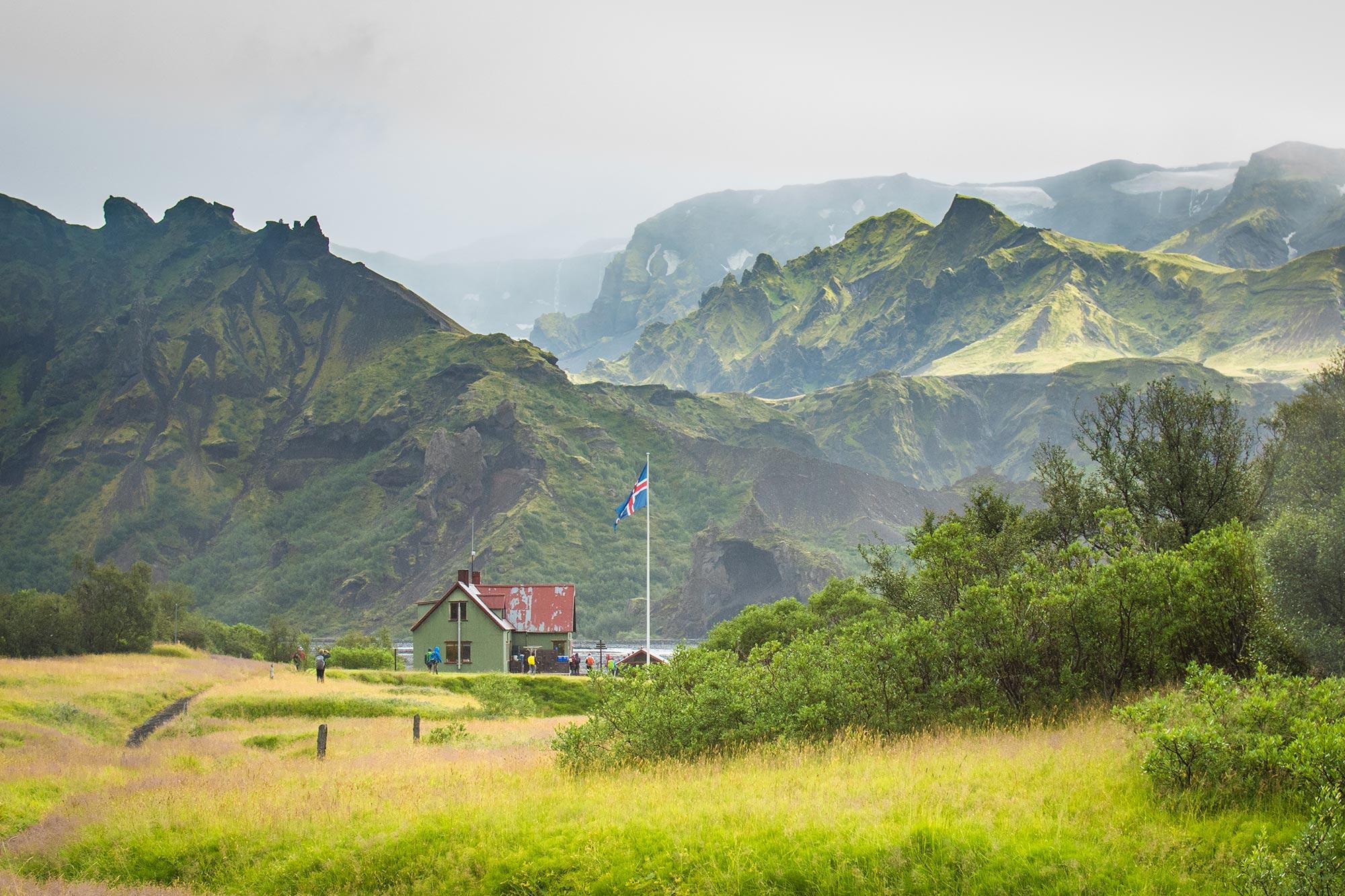 We continue up and down through the small valleys and gullies of Emstrur, where the great Mýrdalsjökull glacier rises only a couple of kilometers away. At the end of the day's hiking the vegetation starts to grow thicker and higher as we descend in to Þórsmörk's (the woods of Thor) green valleys filled with arctic birch forests and colorful flowers. In Thorsmork we catch the evening bus back to Reykjavík.