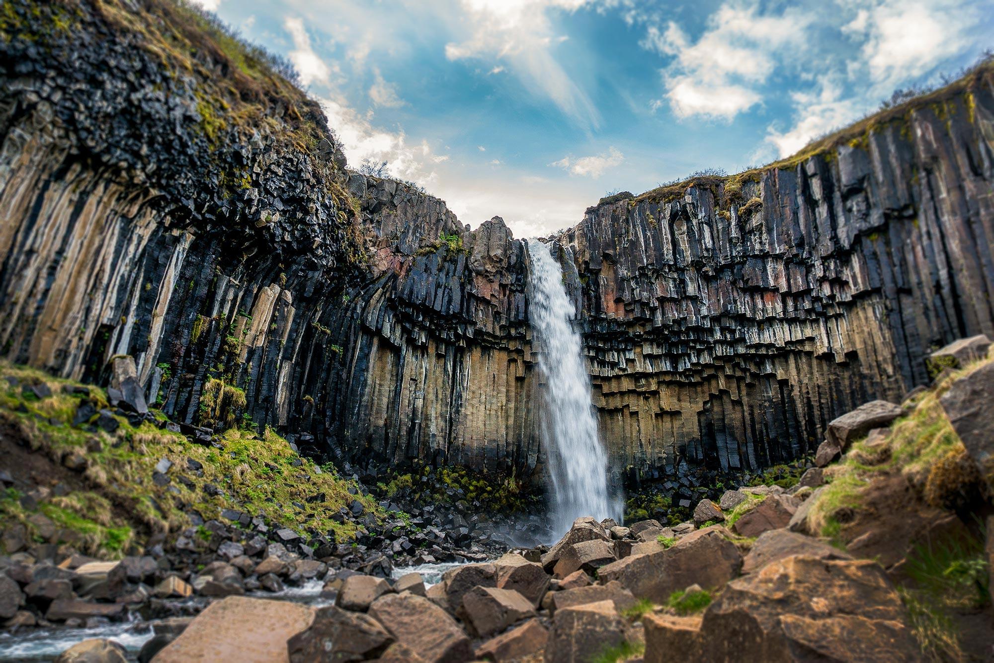 The drive to Skaftafell national park goes across the sands of glacier rivers. At Skaftafell – the green oasis surrounded by glacial outlets and sands of glacial rivers. Take a walk throught the park to Svartifoss waterfall. At Skaftafell it is also the best point to see Hvannadalshnjúkur – highest point of Iceland. Drive further along the ring road with a view of Iceland's largest glacier Vatnajökull will bring you to Jökulsárlón glacier lagoon. Possibility for optional amphibian boat tour among the icebergs. Here we are also within walking distance of the sea. If lucky, you might spot a seal near the shore of the so called „Diamond Beach“ or even in the lagoon. Drive further towards Höfn and continue along the Eastfjords towards Djúpivogur/Breiðdalsvík for the next overnight.