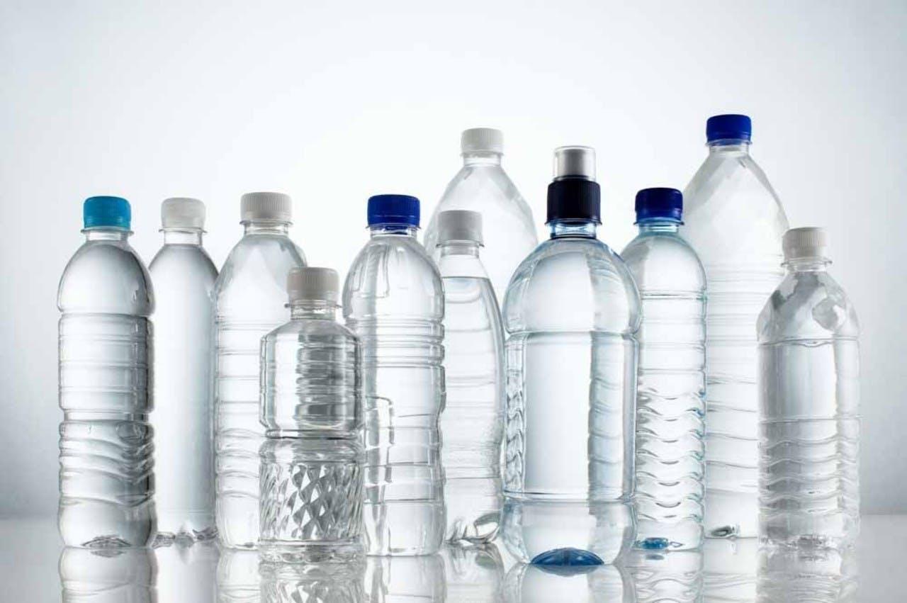 Many plastic water bottles with white and blue tap