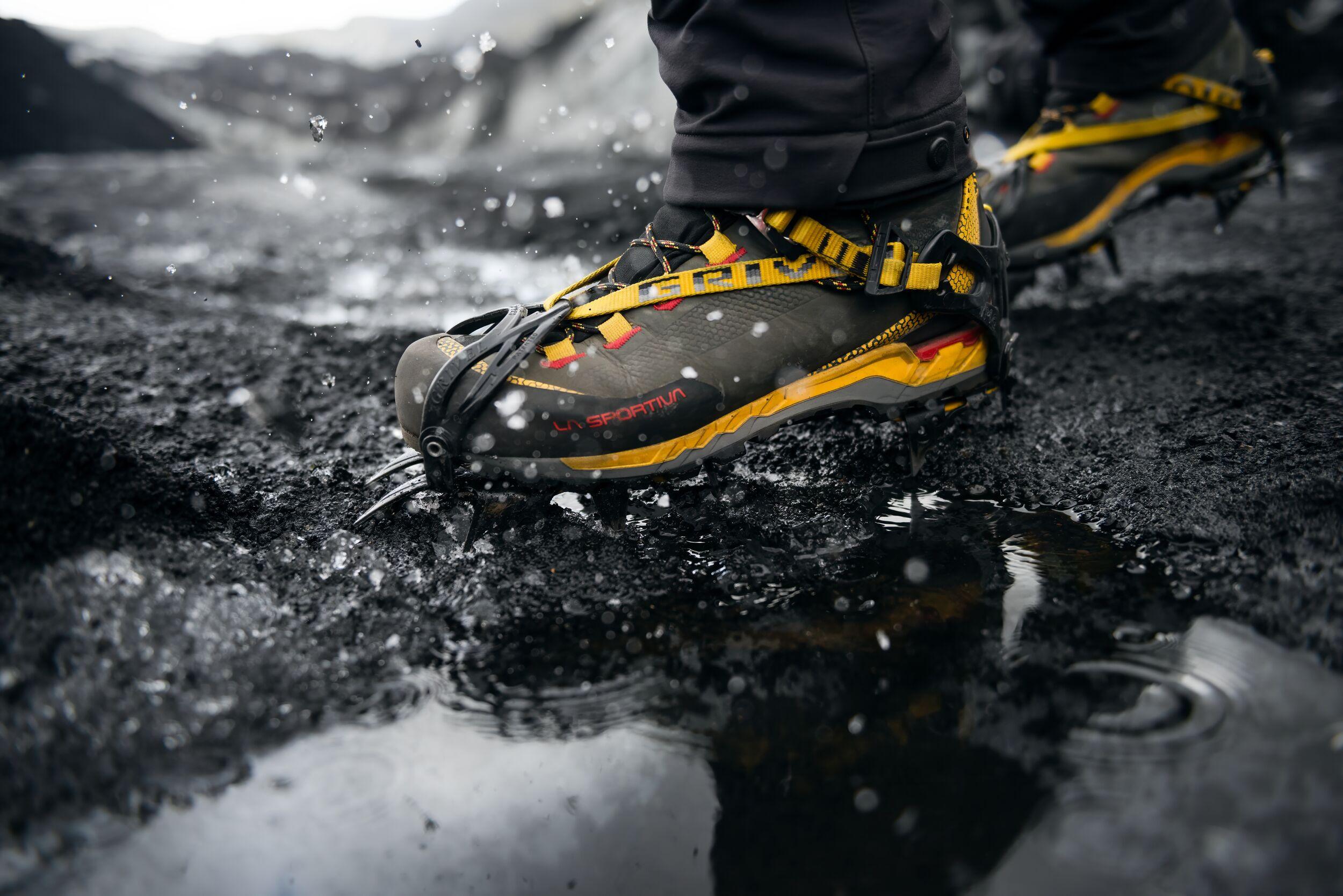 Crampons are metal spikes that strap onto your hiking boots, giving you excellent grip on icy terrain. Think of them as snow tires for your feet! Along with an ice axe and helmet — also provided on all glacier tours — they’re essential for staying safe and confident while exploring the glacier.