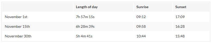 The table below shows some important points in November for sunrise and sunset. Note the rapid decrease in daylight hours by 90 minutes every two weeks.