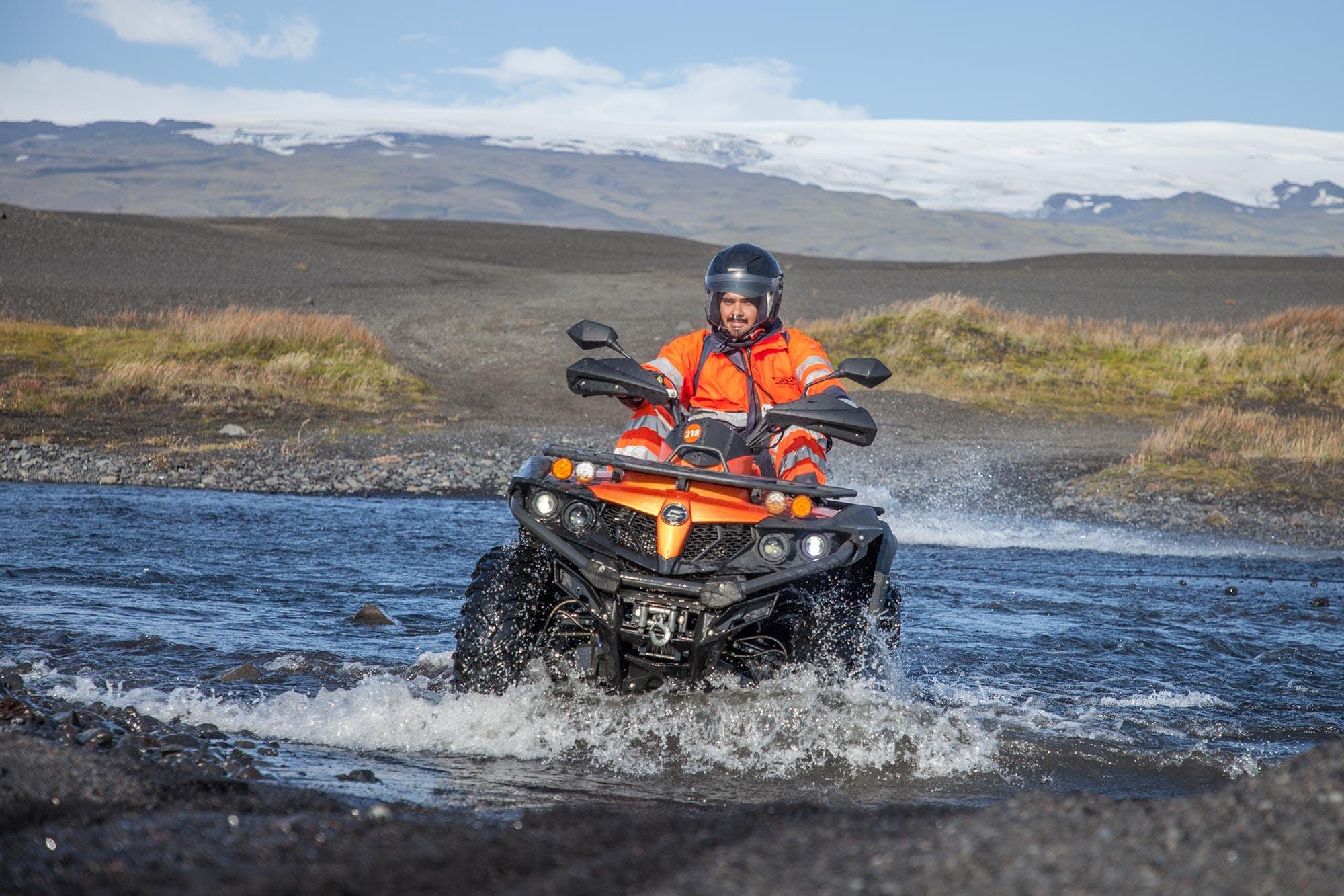This will be an active day at the foot of Mýrdalsjökull glacier. In the morning we will go on an ATV adventure tour that takes us over the black sands of Sólheimasandur down to an iconic black sand beach where we will be able to drive along the shoreline. On our way back over the sands, we will visit the famous Sólheimajökull DC-3 plane wreck and finally drive across a river to get to a beautiful mountain ravine.