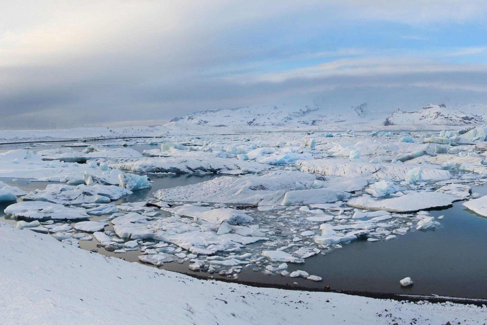 Heading further east, we get to the unique Glacier Lagoon (Jökulsárlón) with huge icebergs floating among the sunbathing seals. A short walk from the lagoon is the Diamond Beach, so called because of the countless icebergs, stranded on their way to the sea.