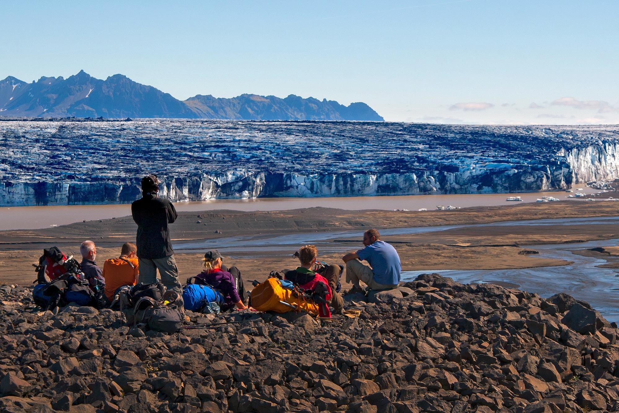 This day is devoted to the crossing of Skeiðarárjökull to Norðurdalur valley, an area surrounded by ice and high mountain ridges. Almost a whole day is required to traverse the 10 km of ice, before standing on solid ground again in the hinterland of the Skaftafell area of Vatnajökull National Park. A magnificent camping area is awaiting us with views over the several glacial lakes with floating icebergs and coloured rhyolite mountains in the background.