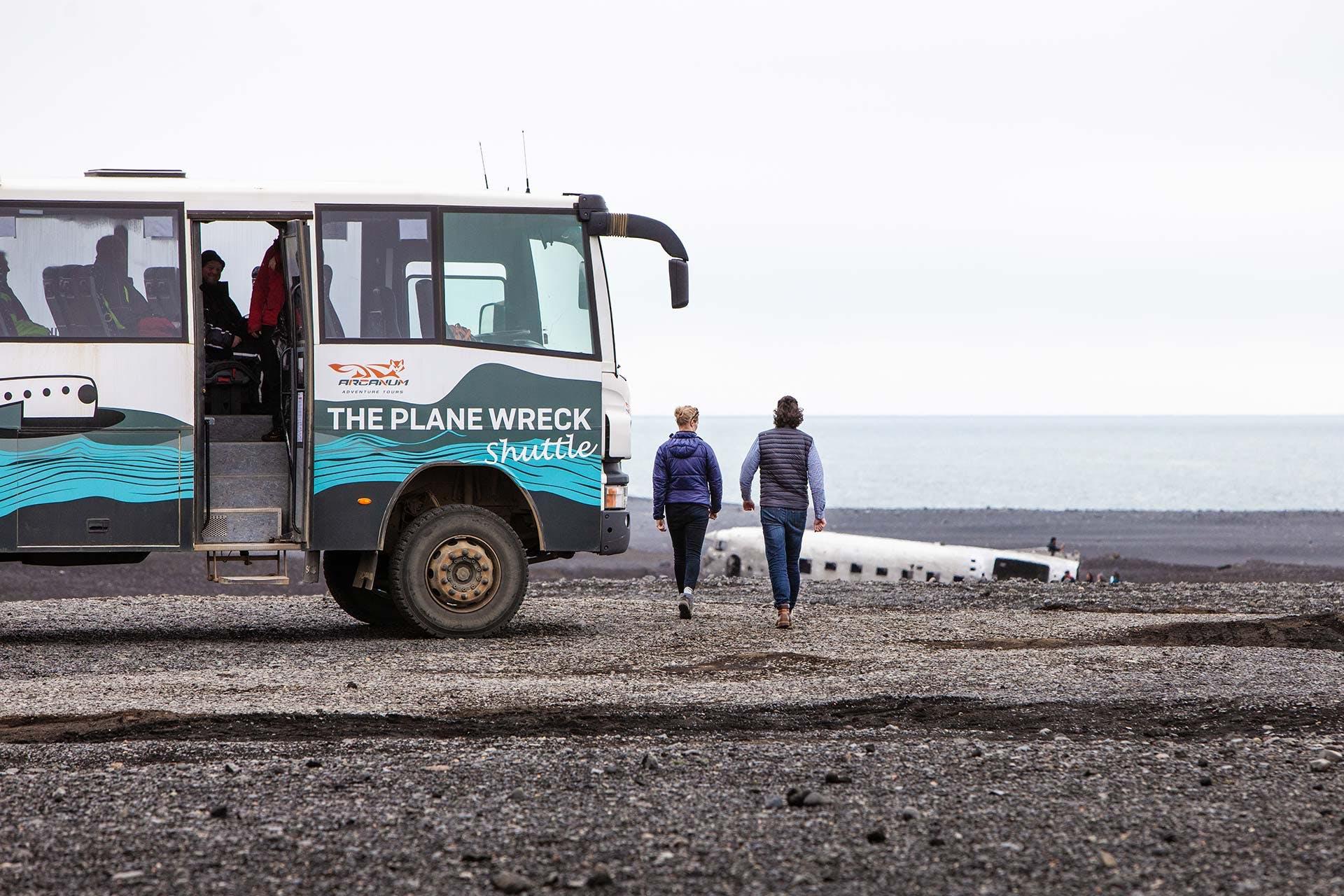 Why walk for almost two hours round trip when you can take a fast and convenient shuttle to the Sólheimasandur plane wreck? This time saving option takes 10 -15 minutes one way and guarantees you a ride back at your allotted time. After you have explored the famous DC plane wreck and the nearby black sand beach (about 500 m one way), you can relax in the shuttle as we transport you back to your vehicle.