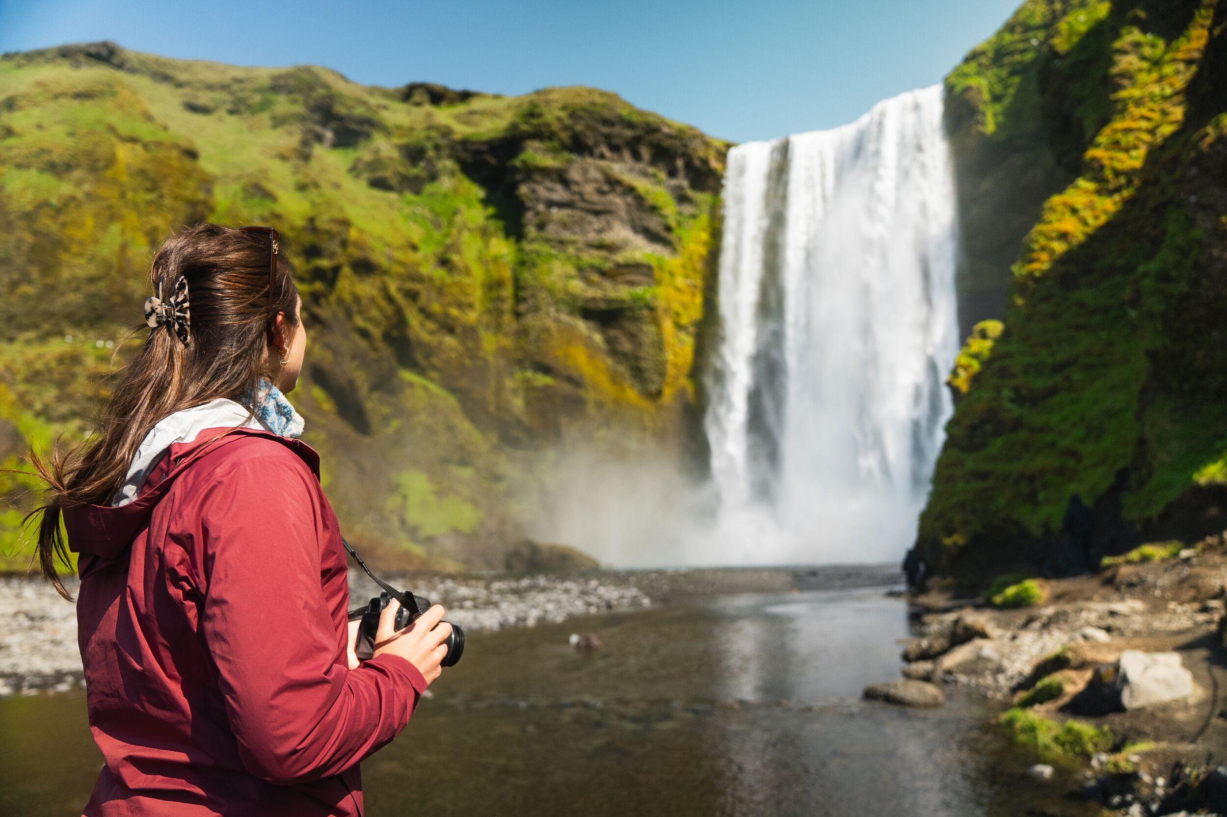 Another highlight of the day is Skógafoss waterfall, one of Iceland’s largest and most impressive cascades. With a drop of 60 meters and frequent rainbows forming in the mist, it’s a powerful and memorable sight.